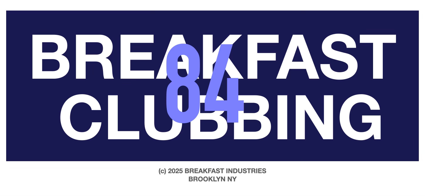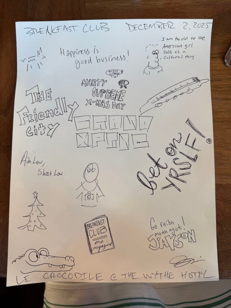 Breakfast Club Williamsburg Report 12.3.25: Today at the middle table we talked about the music scene in Hudson, Carhartt WIP (Work In Progress)‘s event at Food, the artist Lucien Smith, random pop ups popping up in our feeds, snow in Chicago, artists and chefs not being nice, coming into the city, bus wraps, bus routes in San Francisco, Waymo’s becoming more like human drivers, bodega cats, the historically recent domestication of cats, free-range children, architects designing habitats for alley cats, American Girl doll parties, listening to NSync, Porsche AG design, TOM FORD sunglasses, panel discussions, women in leadership, Shopify’s app marketplace, autone, work crushes, managing childcare and work life balance post-COVID, dealing with the dumb community, knowing what drains you, Library180, personal deep cuts, nerding out on magazines, Jason Thome, VISIONAIRE, totems and tokens, the golden age of magazine publishing, newsprint fashion magazines, Sy Newhouse (sr and jr) printing technology, vinyl manufacturing, monopolism, “The Art of War,” destroying the resources of your rivals, The Business of Meaning Podcast question ‘where do you come from’, Breakfast Club Hudson, self-regulating communities, the sponsored events of today and the golden era of sponsored events, hating from outside the club, the era of constant complaint coming to a close, human design capacity for absorbing grievances, normal trains of thought, art in Japan, agencies opening and closing and absorbing each other, the brand pollution of viral discourse, the only brand-free environments on social being dogma, Danny Cole x Anthpo, gaming the system, the “Marty Supreme” campaign, Timothee Chalamet as the maximum manifestation of Metamodernism (or is it Zohran Mamdani? Or is it K-Pop Demon Hunters?) everybody wanting to be the DJ but nobody wanting to dance, self-surveillance, getting past to the sauna barrier, the no-stakes commentariat, the marketing ouroboros, the HAAC mode era, PoMo Disco and lots more.